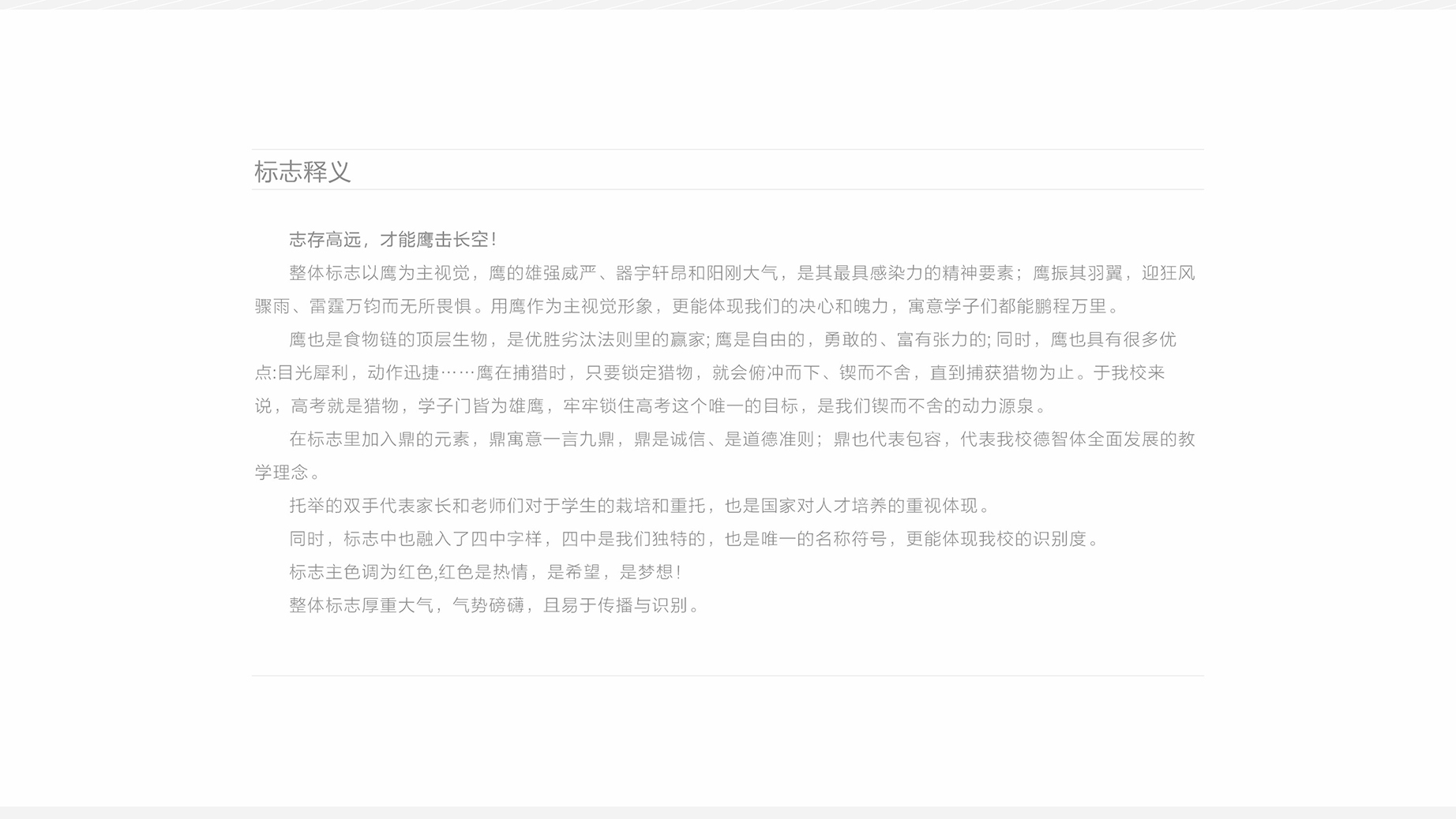 宁强县第四中学是省、市、县为优化高中教育布局调整,顺应广大人民群众对普通高中教育的需求而成立的公办普通高级中学。经过三年筹划,2017年新校区投入使用,2019年建成省级标准化高中学校。 学校环境优美,设施现代,交互式电子白板教室、探究实验室、计算机网络教室一应俱全,图书阅览室800平方米、藏书5万余册。为实现学生个性化发展,学校专门建设了2个音乐教室、1个舞蹈教室、2个美术教室、3个画室、4个琴室和10个社团活动室,以及600平方米的高标准跆拳道馆和800平方米的多功能活动室。 志存高远,才能鹰击长空! 整体标志以鹰为主视觉,鹰的雄强威严、器宇轩昂和阳刚大气,是其最具感染力的精神要素;