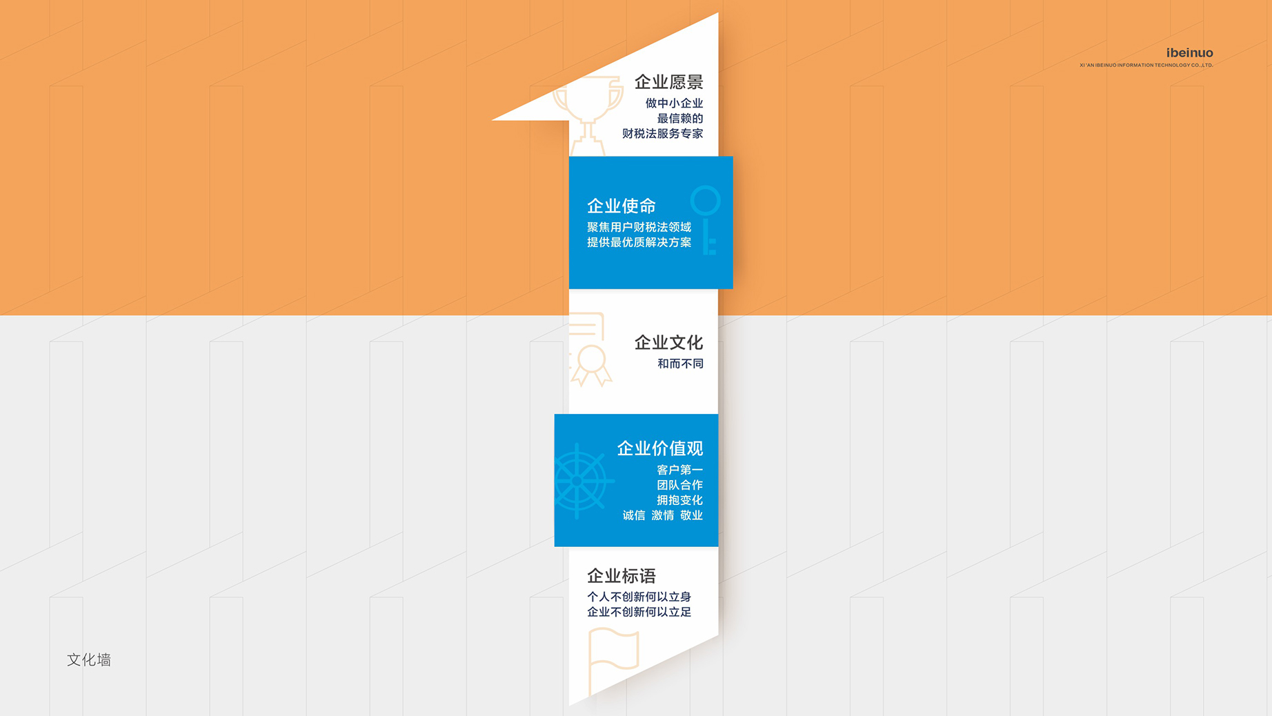西安壹贝诺财税管理有限公司是一家新型的互联网+财税法公司,高新技术文化氛围浓厚,公司主营业务是借助“慧算账”云记账平台,以互联网和移动互联网形式为西安市70万家中小微型企业提供全生命周期的财税金融一体化服务,彻底颠覆传统的财务记账模式,实现客户价值最大化,财税服务高端化。 一般的财税公司形象大多与铜钱、算盘有关,为了让壹贝诺这个品牌更具时代感,我们摒弃传统的设计思路,以数字1位设计基础型,在主体构成的数字里加入了文件夹的元素,使之更有意义。整体方案别出心裁,独具匠心。