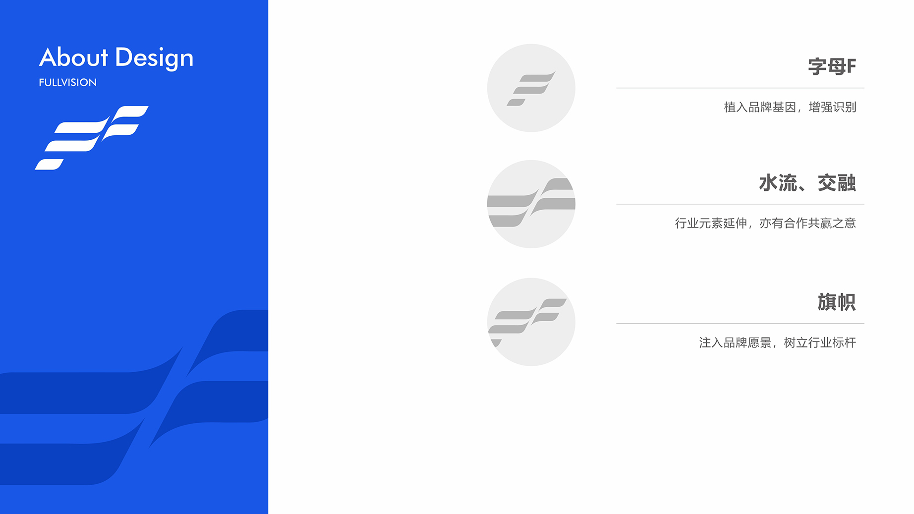 富锐是一家有着20年发展历史的实业公司,公司多年来致力于泳池的设计与生产,是行业内的龙头企业。但随着企业的不断发展壮大,公司业务已经触及到了国外市场,并取得了傲人的业绩,所以企业的品牌形象就需要跟上市场步伐,变得更大气、更国际。 字母F是富锐的首字母,所以我们将F作为设计基础型,在F的基础上揉入流线元素,加入水的概念,从而将F这个字母私有化。标志标准色采用水蓝色,跟行业属性相匹配,整体设计流畅自然,简约大气,扁平化的设计也更方便后期的应用与延展。